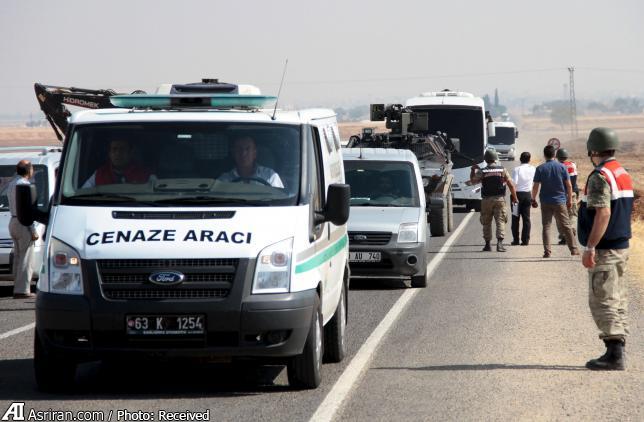 آمبولانس های حامل جنازه خانواده کردی در منطقه مرزی سوروچ ترکیه و در حال عزیمت به شهر کوبانی